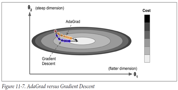 - 일반적으로 AdaGrad뿐만 아니라 모멘텀 최적화, 네스테로프 최적화보다 성능이 좋다.