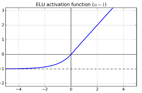 - ELU : \({ ELU }_{ \alpha }\begin{cases} x,\quad x\quad >\quad 0 \\ \alpha ({ e }^{ x }\quad -\quad 1),\quad x\quad \le \quad 0 \end{cases}\)