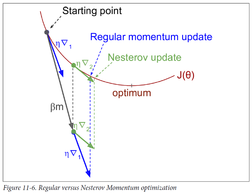 - \(\theta\)가 \(\theta - \beta m\)의 gradient를 계산하는 것이 기본 모멘텀 최적화와 다른 점이다.