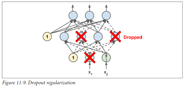 - 매 훈련 스텝에서 각 뉴런이 확률 p에 의해 드롭아웃 된다.